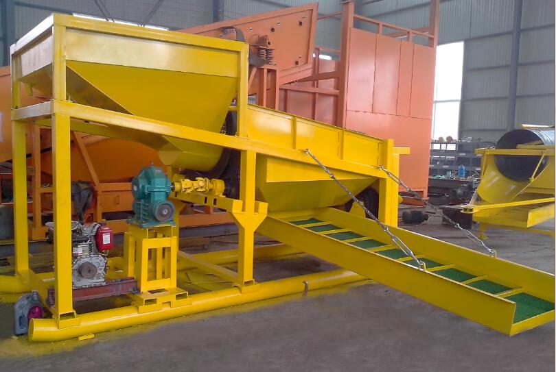 一種小型沙金機(jī)械 小型的沙金機(jī)械有移動(dòng)式的,有滾筒式的,這種在沙金礦開采中移動(dòng)比較方便,篩分、洗礦、黃金回收作用一個(gè)不少,只是產(chǎn)量稍微小了點(diǎn)??梢圆捎眯⌒偷墓こ虣C(jī)械來配合給料,采用小型的水泵來供水。這種設(shè)備生產(chǎn)成本低。